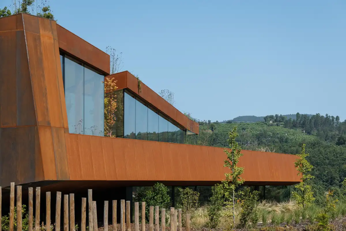 O projeto da Casa Corten foi concebido a partir de uma leitura sensível e contextualizada do local, anteriormente ocupado por uma antiga unidade fabril de madeira, hoje em ruínas, da qual apenas sobraram vestígios de chapas metálicas oxidadas. A implantação e volumetria do edifício foram cuidadosamente articuladas com as curvas de nível do terreno, permitindo uma integração topográfica natural e uma minimização do impacto da construção na morfologia e paisagem envolvente.