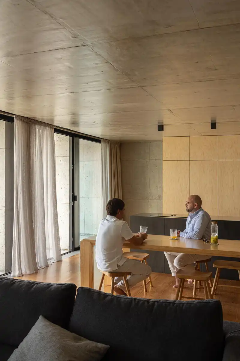 Mas estas grutas são habitáveis. No interior, a madeira aquece o espaço e contrasta coma frieza do betão. O programa é simples: três quartos, uma zona social aberta e fluida, ventilada naturalmente e iluminada por um pátio central que rasga o volume. Tudo o que não é essencial, não existe.