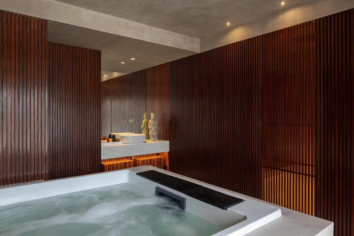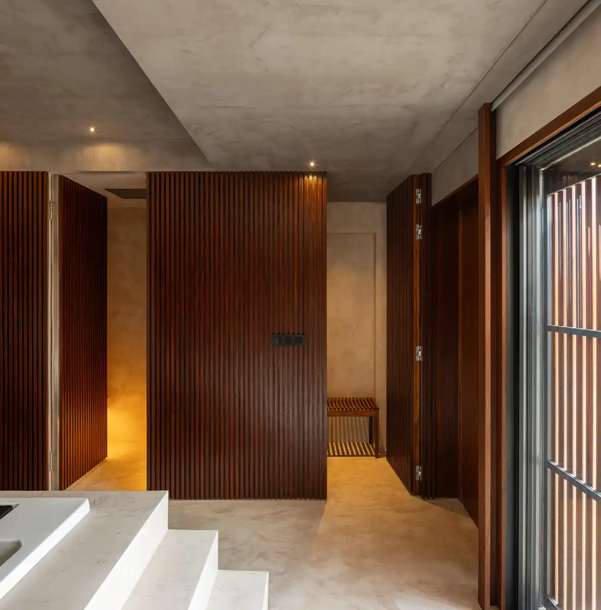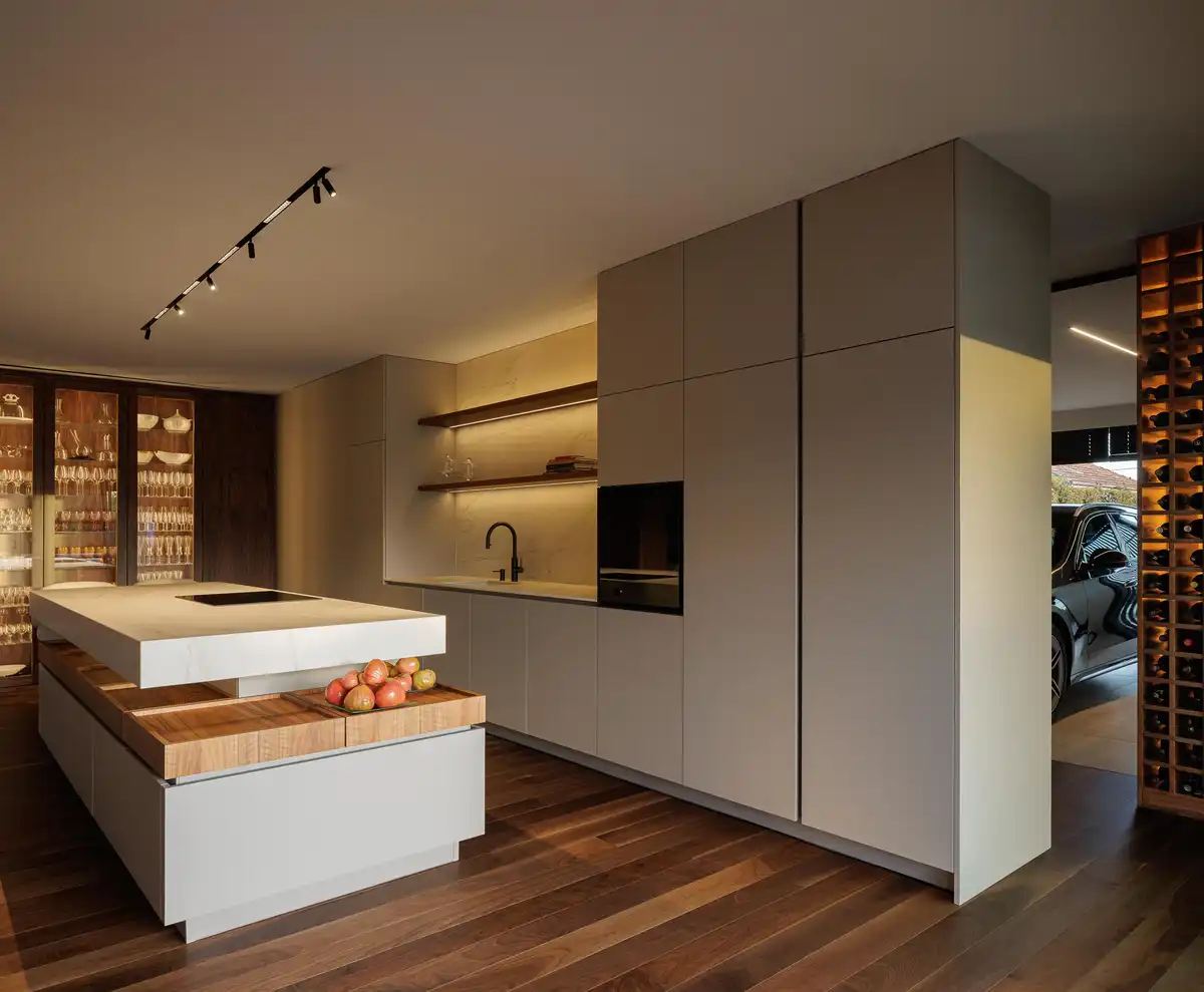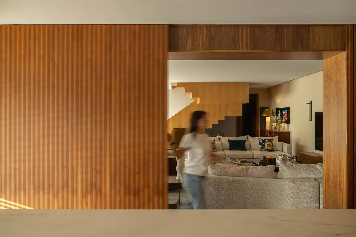 On the ground floor, the social areas are concentrated in a continuous space where the living room, dining room, and kitchen merge into a single environment. The fluidity between spaces is reinforced by material uniformity, particularly through the use of wood, which conveys unity and amplitude. The relationship between living and kitchen areas can be modulated by sliding wooden panels, allowing for different degrees of openness and privacy depending on the occasion. This floor also integrates a laundry, pantry, service bathroom, garage, and the main suite, which includes a walk-in closet, bathroom, and a spa area with direct access to the exterior.
