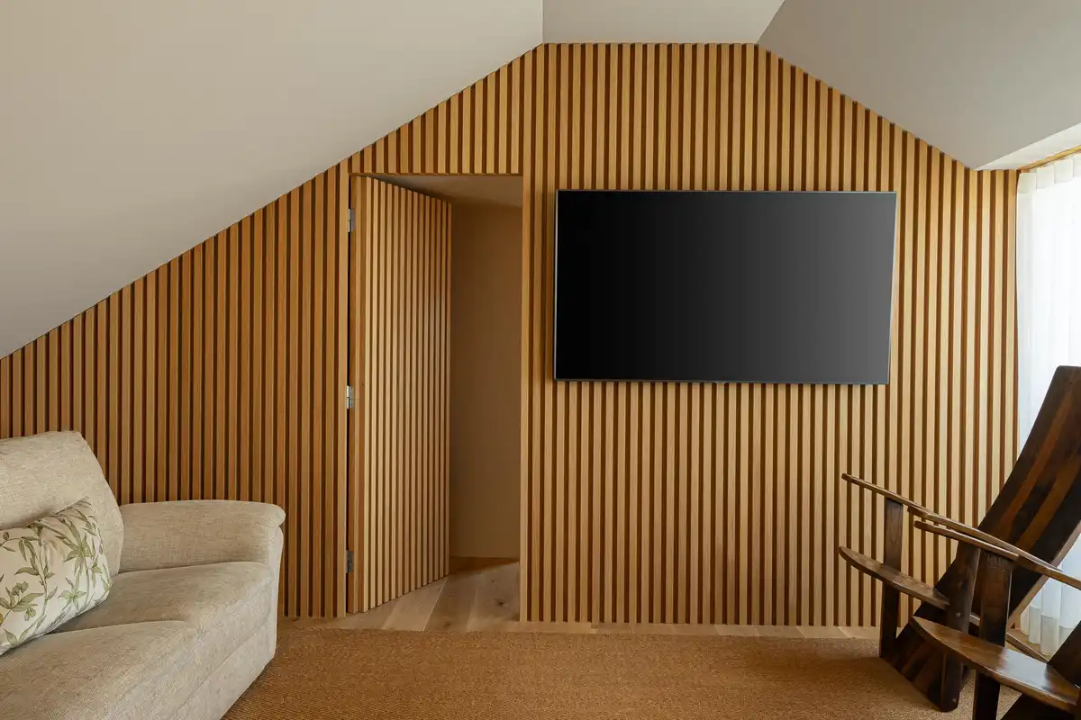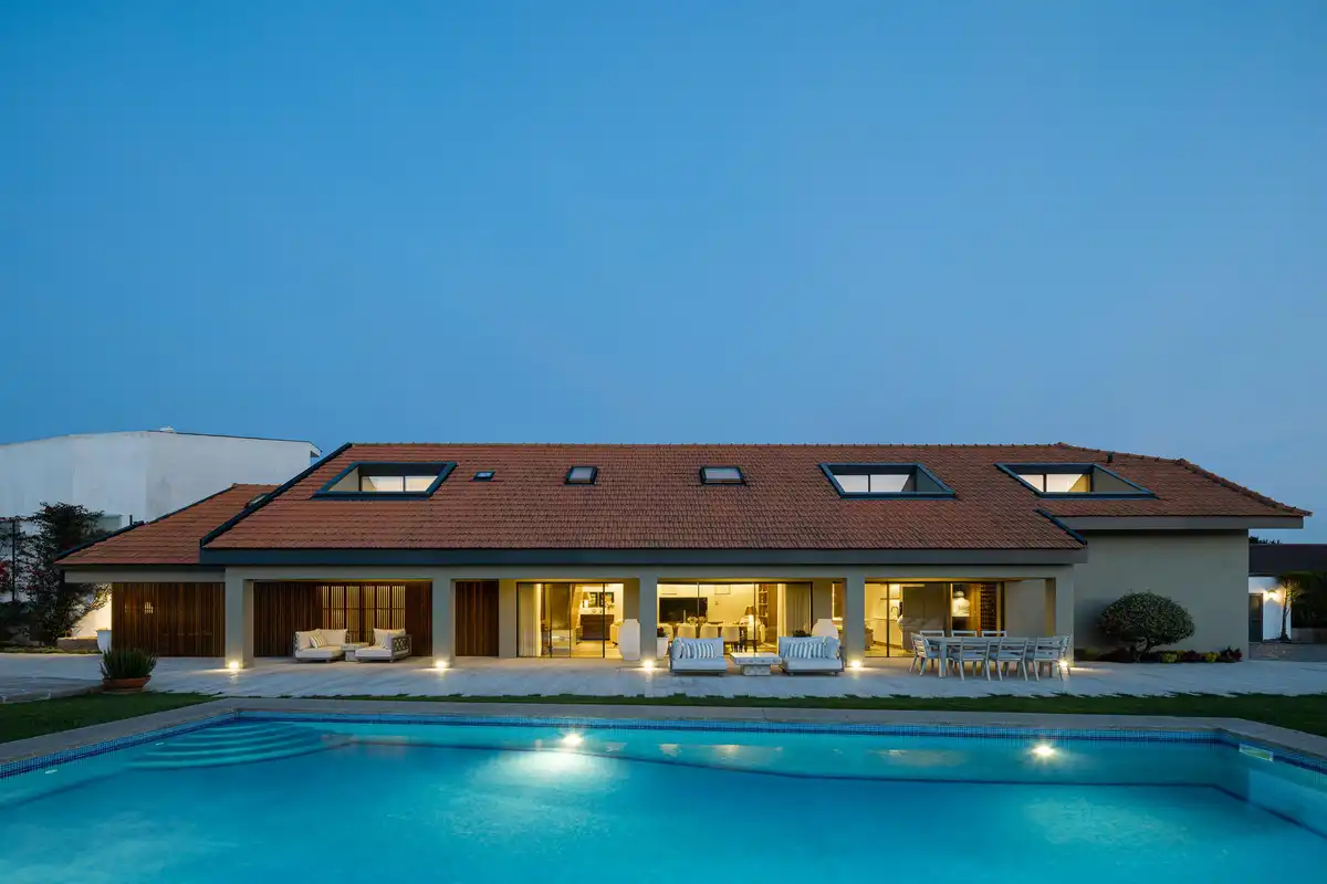 The upper floor contains two suites and a spacious lounge, all with access to balconies. The pitched roof incorporates strategically positioned skylights, ensuring abundant natural light. It further extends beyond the perimeter of the house, creating a covered outdoor area that enhances open-air living while providing solar protection.