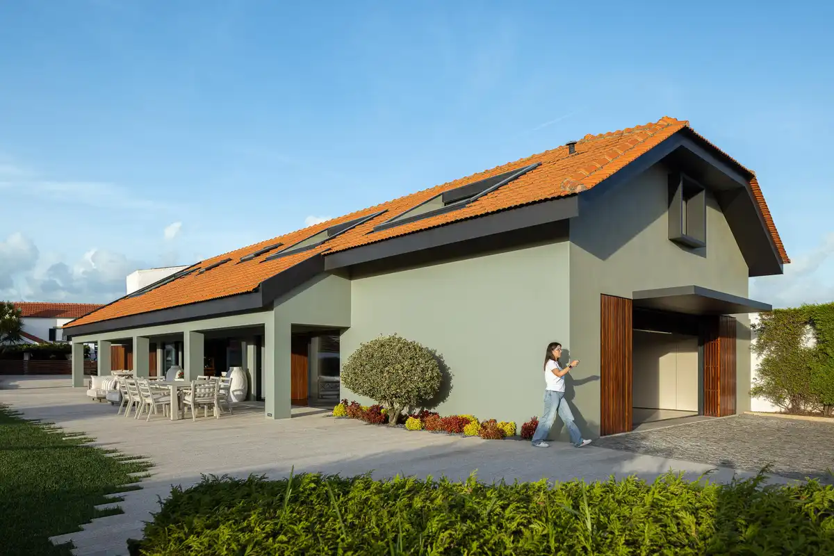 O piso superior acolhe duas suítes e um salão amplo, todos com acesso a varandas. A cobertura inclinada integra claraboias estrategicamente posicionadas, que asseguram iluminação natural. Além disso, prolonga-se para além do perímetro da casa, formando uma área exterior coberta que amplia as possibilidades de uso e permanência, ao mesmo tempo que assegura proteção solar.