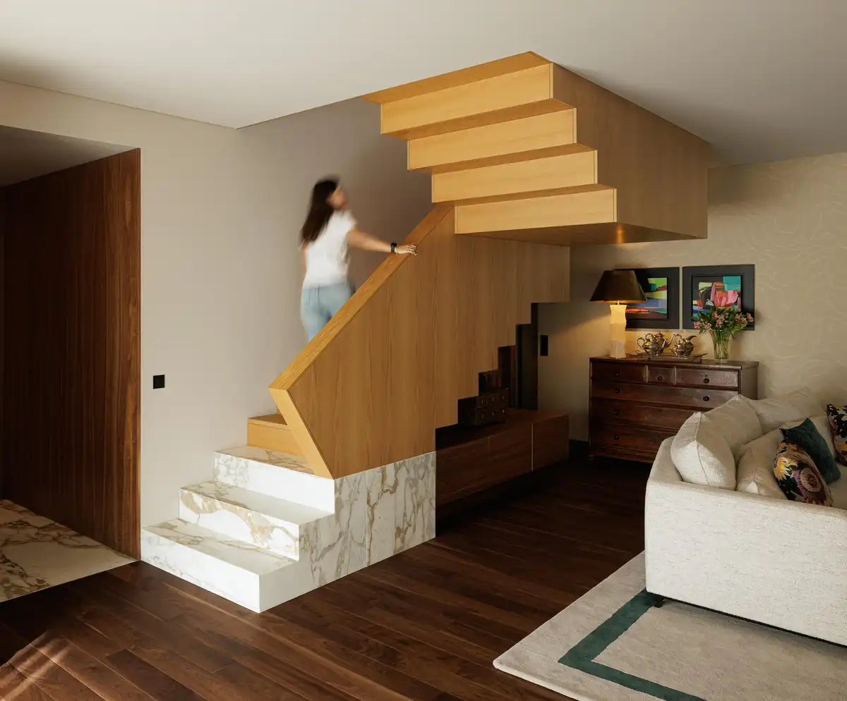 The dwelling program is distributed across two floors, connected by a rehabilitated staircase that stands as a symbolic and sculptural element of the intervention. Its base is formed by stone steps, aligned with the flooring of the entrance hall, establishing a material continuity that anchors the space to its pre-existence. From this foundation, the staircase unfolds in wood, introducing lightness, warmth, and rhythm to the ascending path, leading from the most public areas of the house to its more private domains.