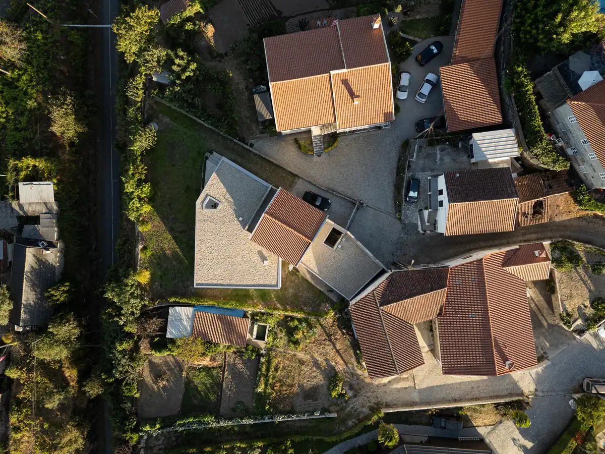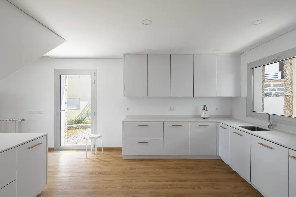 Within the remaining space of the ruin, in addition to the entrance, the kitchen is established — the noble area of homes in this region of Minho — in the similar position as the original, thus preserving the logic of its previous use. Above it, a small volume defines the studio/atelier, maintaining the two existing floors with a traditional tiled roof, subtly integrating the construction into its surroundings in discreet dialogue with the neighboring houses.