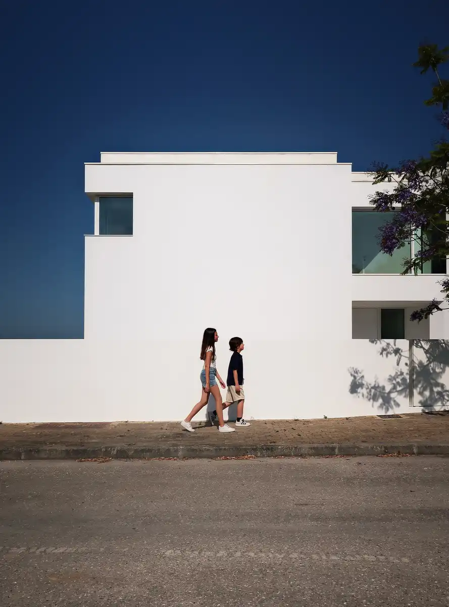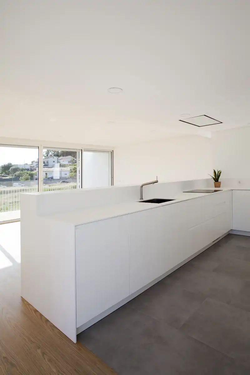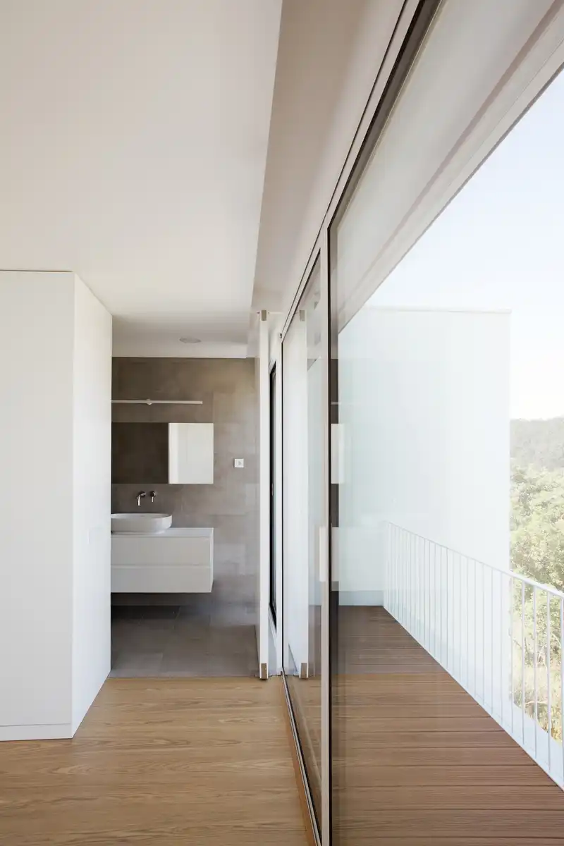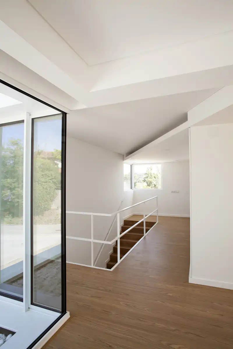 The building is composed of two main volumes, each aligned parallel to the facades of the nearest houses in the development, connected by a third, a small, wedge-shaped form, through which the entrance is made and internal circulation is organized. The House of 15 Windows reveals its spatial organization in a gradual way, and the entrance, acting almost as a hinge, reveals the heart of the home, from which all the other spaces unfold. Natural light plays a central role here, entering all the rooms of the home, including the interior spaces, through skylights, reducing the need for artificial lighting during the day; the 15 windows, strategically distributed across the facades, help define these spaces while framing different views of the surroundings. The position, scale, and orientation of each window were carefully considered, letting the place itself dictate how light enters and how the view from inside is composed.