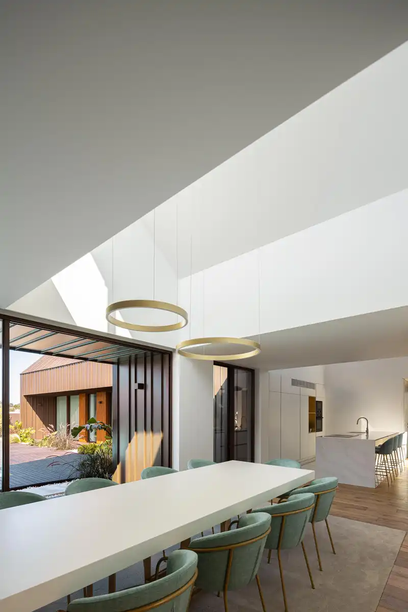This positioning defines the development of the program. The further inland the site, the more private and reserved the space. The composition of the volumes and their openings to the exterior provide the interior with controlled light and an extension of the interior space to the exterior. Their form and materiality are intended to embody the typical buildings of this area.