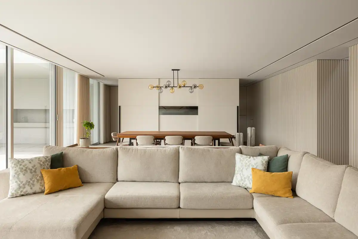 The social area formed by a combined living–dining space and a semi-open kitchen. These spaces flow naturally toward the covered veranda and swimming pool, reinforcing the continuity between interior and exterior and encouraging outdoor living.