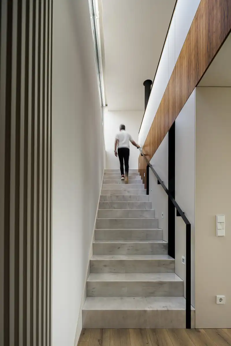 Inspirada nas influências nórdicas, a moradia abre-se diretamente para a rua, numa opção estética e funcional que promove a simplicidade volumétrica, transparência e uma vivência quotidiana mais fluida. A opção de não murar o lote, permite que a própria volumetria da moradia encerre e defina os limites de forma subtil e integrada. Assim, a frente do terreno é libertada para um jardim minimalista e estacionamento exterior privativo, reforçando a leveza e despojamento da implantação.