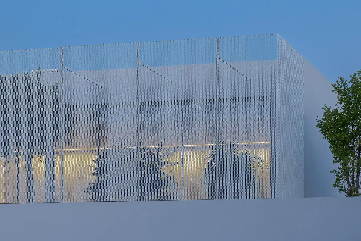 Organized across two levels, the upper floor assumes a distinctly private character, accommodating the home’s three bedrooms. One of the defining features of this floor is a continuous balcony that extends along the east–south façade. Fully glazed, it offers expansive, breathtaking views over Mount Sameiro, reinforcing the visual connection with the natural surroundings and flooding the interiors with daylight throughout the day. On the opposite façade, an intimate garden is positioned, screened from the public street by a perforated metal panel that guarantees privacy while allowing controlled natural light to enter and illuminate the adjacent circulation area.