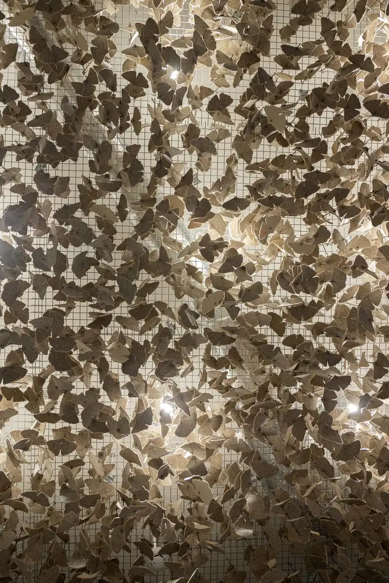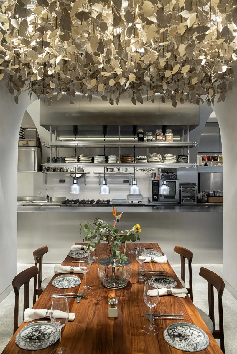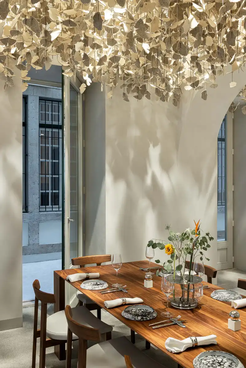 Lighting is both diffuse and striking, articulated through large fan-shaped fixtures that punctuate the first space, and Ginkgo Biloba leaves crafted in burel, creating a welcoming and delicate effect.