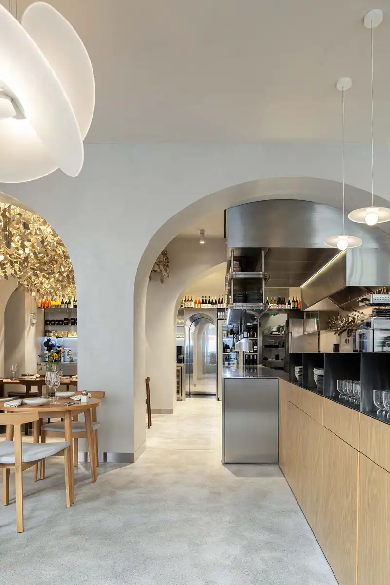 The project transforms a ground-floor space in an 18th-century building into a restaurant with unique features, preserving and highlighting the most significant elements of the existing space — the Arches.