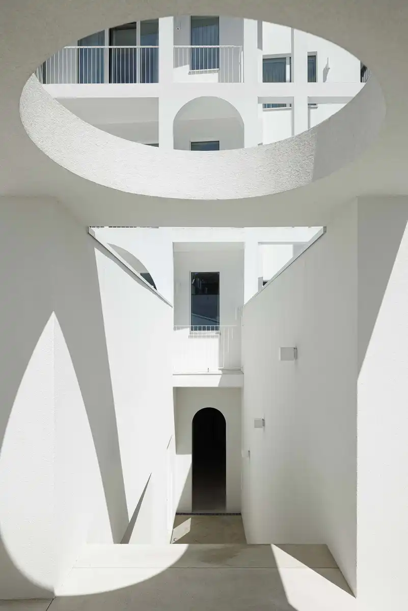 The project navigates on the plasticity of the architectural object and its mass, void, and proportion. Inspired by early 20th-century Portuguese bourgeois dwellings — in which rooms unfolded without corridors, as a sequence of spatial chambers — the internal layout adopts a similar distributive logic. Circulation becomes ambient rather than directional. Each unit is defined not by repetition but by variation, with vaulted ceilings that shift in height, proportion, and curvature according to programmatic use. These elements introduce a tectonic rhythm that elevates everyday spatial experience into a more ceremonial register.