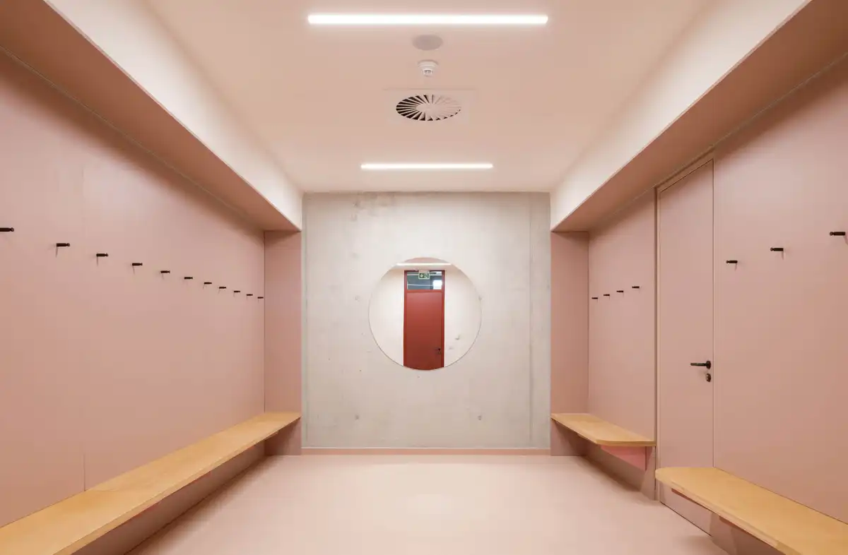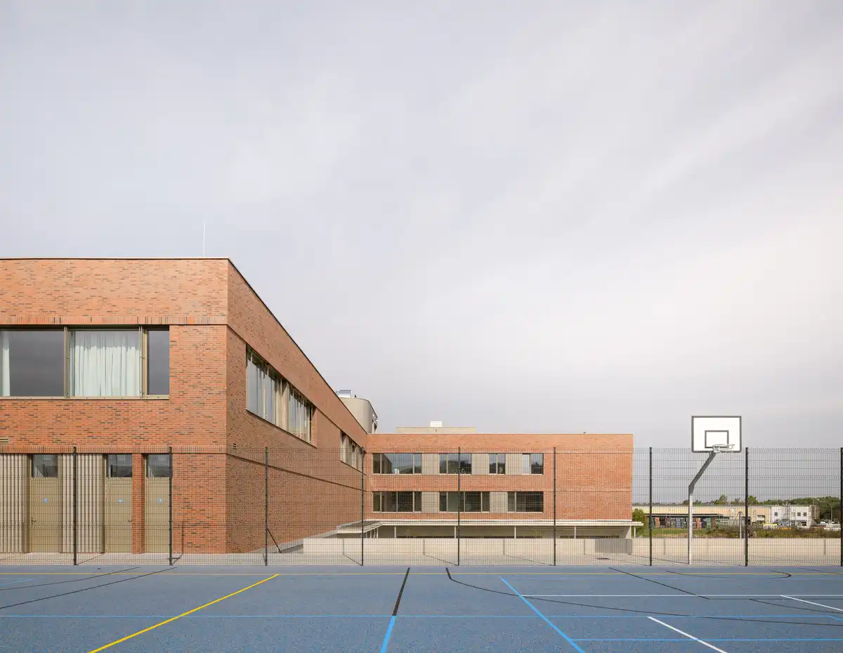 The school is designed to meet the energy performance class A. Heating is provided by heat pumps, and all spaces are equipped with controlled mechanical ventilation, while each occupied space can also be naturally ventilated through operable windows. The overall energy balance is enhanced by photovoltaic panels on the roofs of both the main school and the sports building, as well as by external shading, and high-quality thermal insulation. The building’s structure is reinforced concrete with masonry infill, contributing to the thermal mass and stability of the building. The exterior façade is clad in ceramic elements. Roof canopies along the façade and planted “tree nests” help to prevent the formation of heat islands.