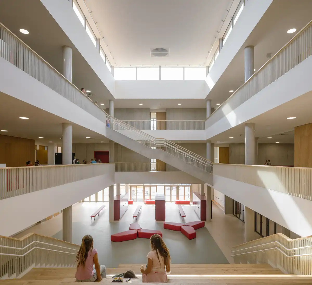 The entrance courtyard serves pupils, visitors to afternoon programs, and the general public. It includes lounging platforms for teenagers and sports surfaces for younger pupils. The second courtyard features outdoor dining tables extending the canteen’s capacity. It also provides space for play during recesses and leisure between afternoon activities. Play structures, soft surfaces for jumping and running, a rope pyramid, and other equipment are integrated into this area. Access to the inner courtyard is possible from the school hall, the canteen, and the practice kitchen.