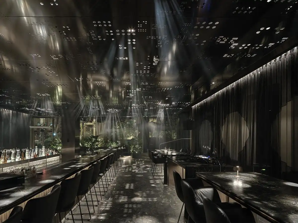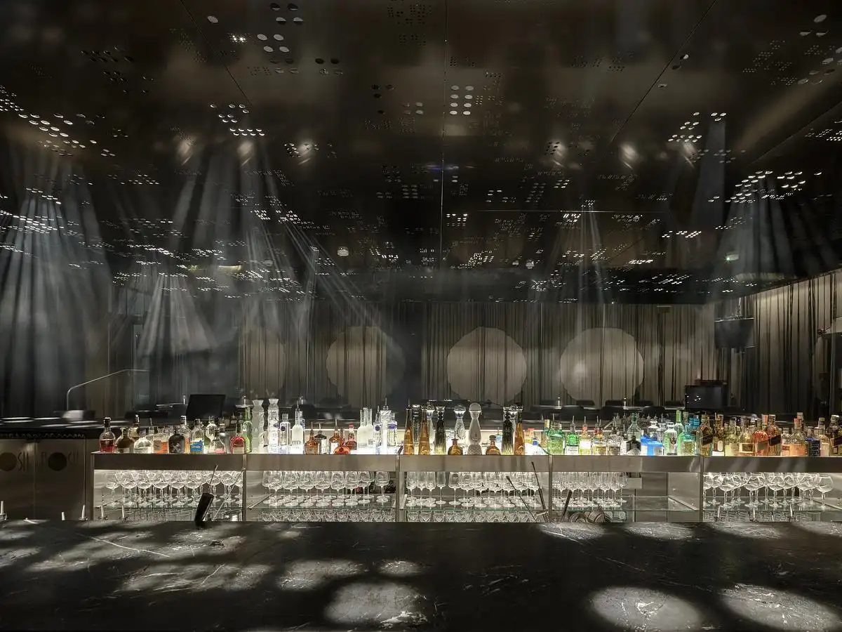 The ambiance can be changed through three different lighting scenes: a bright one focusing the light on the tables for dining, a second one that is more dimmed for the bar time after dinner, and the last scene is a party setting, where the main element is a movable fractal light, which is controlled through a KNX system.