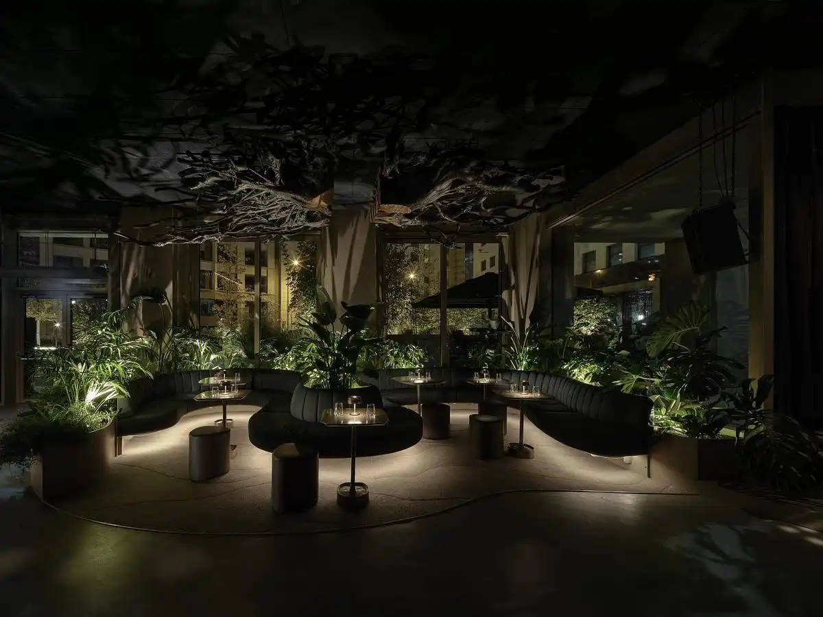 The interior design for MOSH Bar & Dinner is a highly transformative space, located in the heart of Bucharest, Romania, smoothly shift between haute cuisine, mixology, and club vibes, merging hospitality, art, and design in a very distinctive way. We call it “The Multitalented Space”, where people experience added value beyond functional and aesthetic qualities. It is structured into the garden lounge, private dining, and an epicenter – a room-in-room structure unifying a bar, two communal tables, and a DJ booth. The space is equipped with a high-end sound system by Lambda Labs and has a very strong focus on highly optimized acoustics. These three areas are at the center of the room, under a built-in canopy.