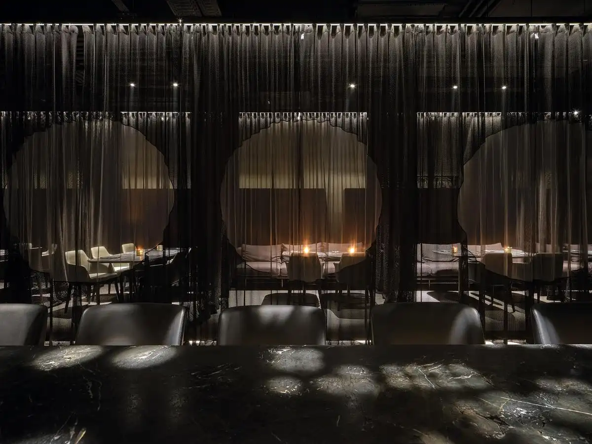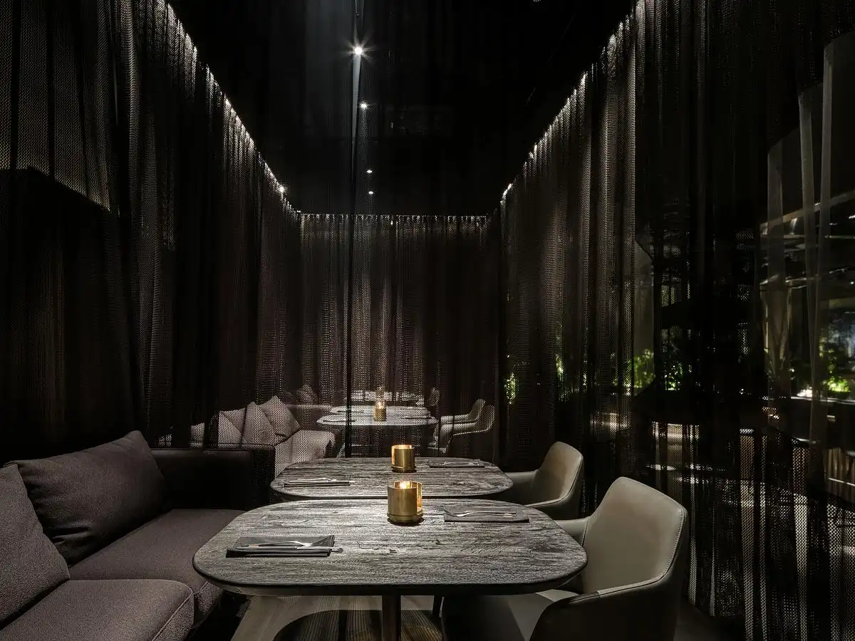 The slightly elevated private dining area, enclosed by translucent curtains, offers more privacy and exclusivity for smaller groups of guests.