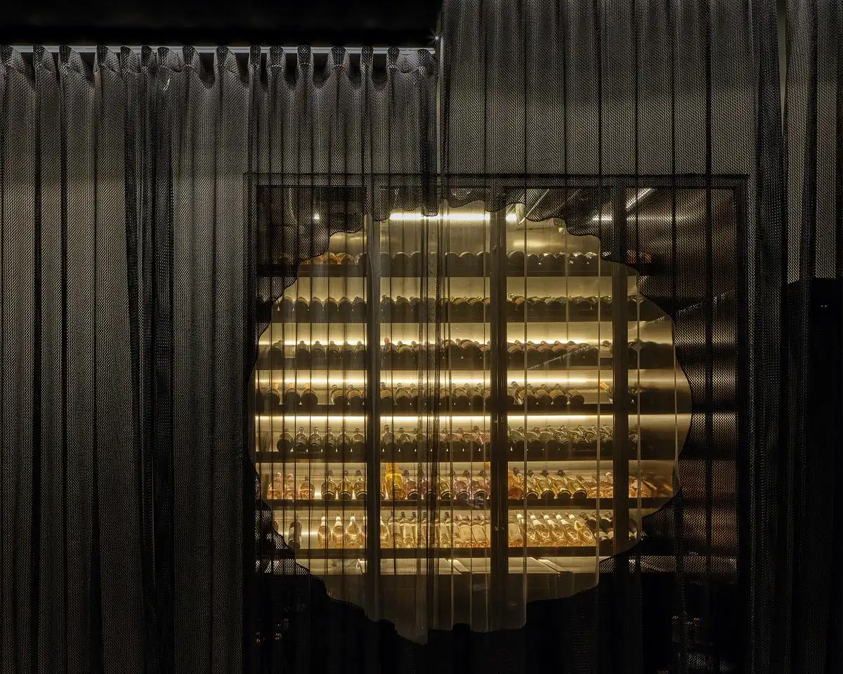 INNOCAD developed the restaurant’s logo, inspired by a place setting, with the key element being a circle, acting as a symbol for a plate, social connectivity, and coming together. This circle is implemented in the fractal lighting concept and the customized curtain that wraps around the entire space, zoning off the private dining areas.