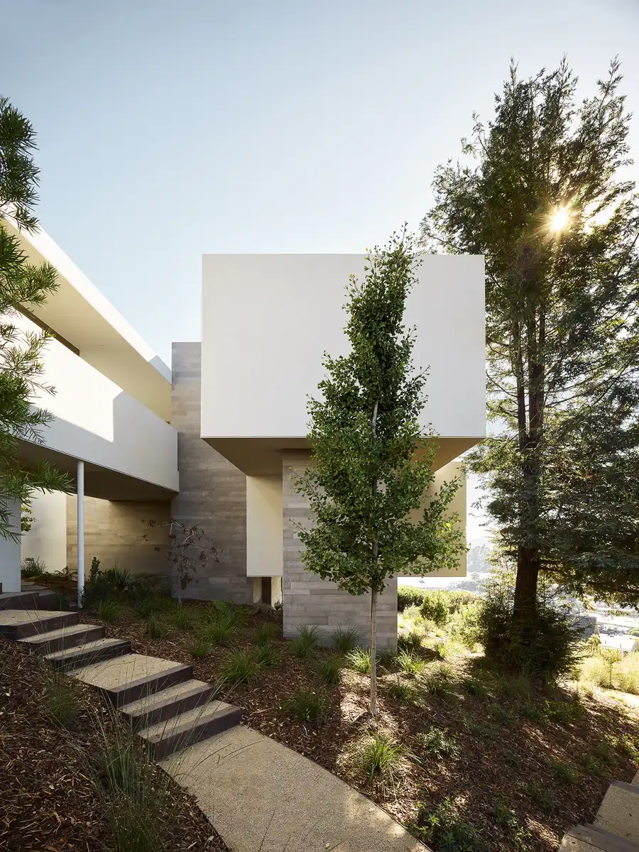 The landscape design by Stefan Thuilot dialogues engagingly with the architecture through well-placed outdoor areas, and moves with the hillside topography, as it slopes from the street on the north side to the property line on the south side. The material palette of integrally colored cement plaster, clear anodized aluminum windows and doors, stained T&G cedar siding, and Windsor Limestone was expertly built by Stroub Construction.