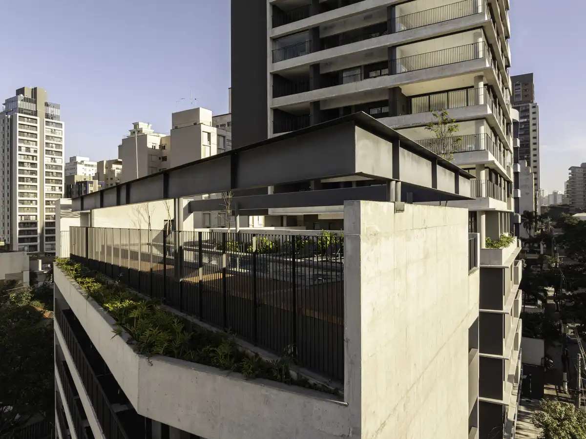 The facades bring rhythm and movement through the alternation of solids and voids, in addition to the use of vegetation as an architectural element that contributes to shading, human scale, and integration with the neighborhood. The presence of greenery extends to terraces and rooftops, revealing a concern with porosity and the continuity of the landscape on a vertical scale.