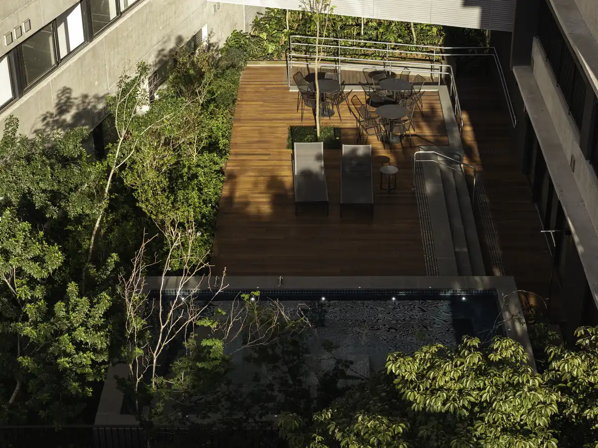 The sixth floor connects the two blocks and houses shared amenities, such as a gym, fitness areas, saunas, and a swimming pool – the latter being located atop the commercial block and accessible via a bridge, offering a pleasant view of the Jardins neighborhood.