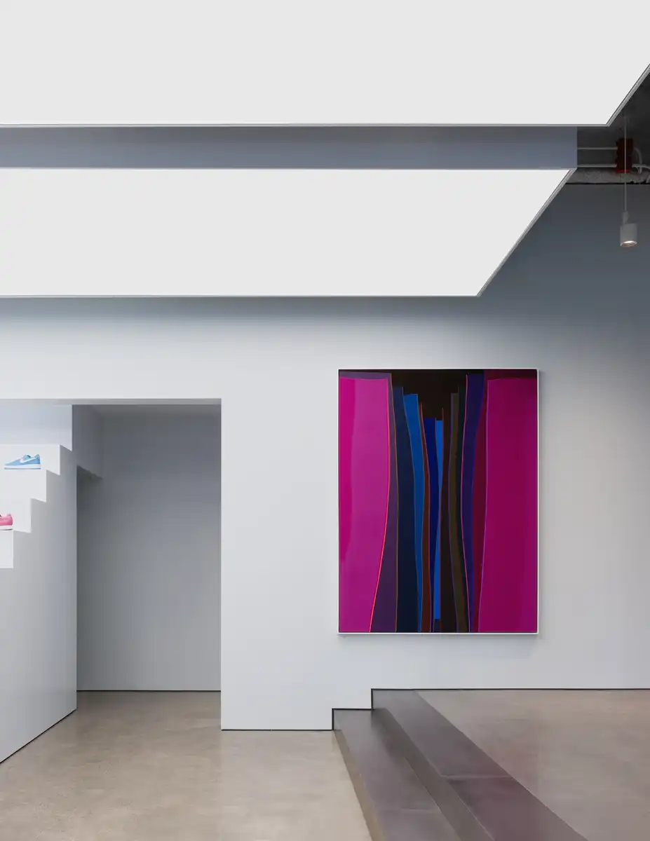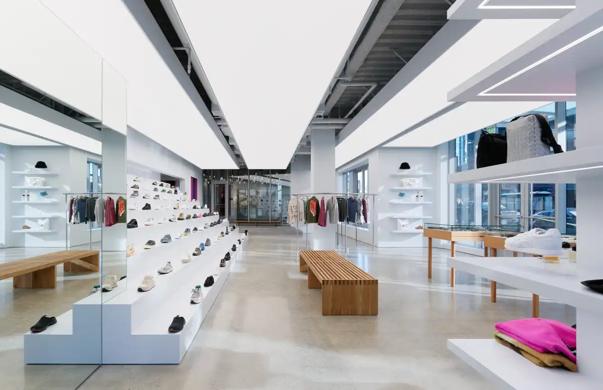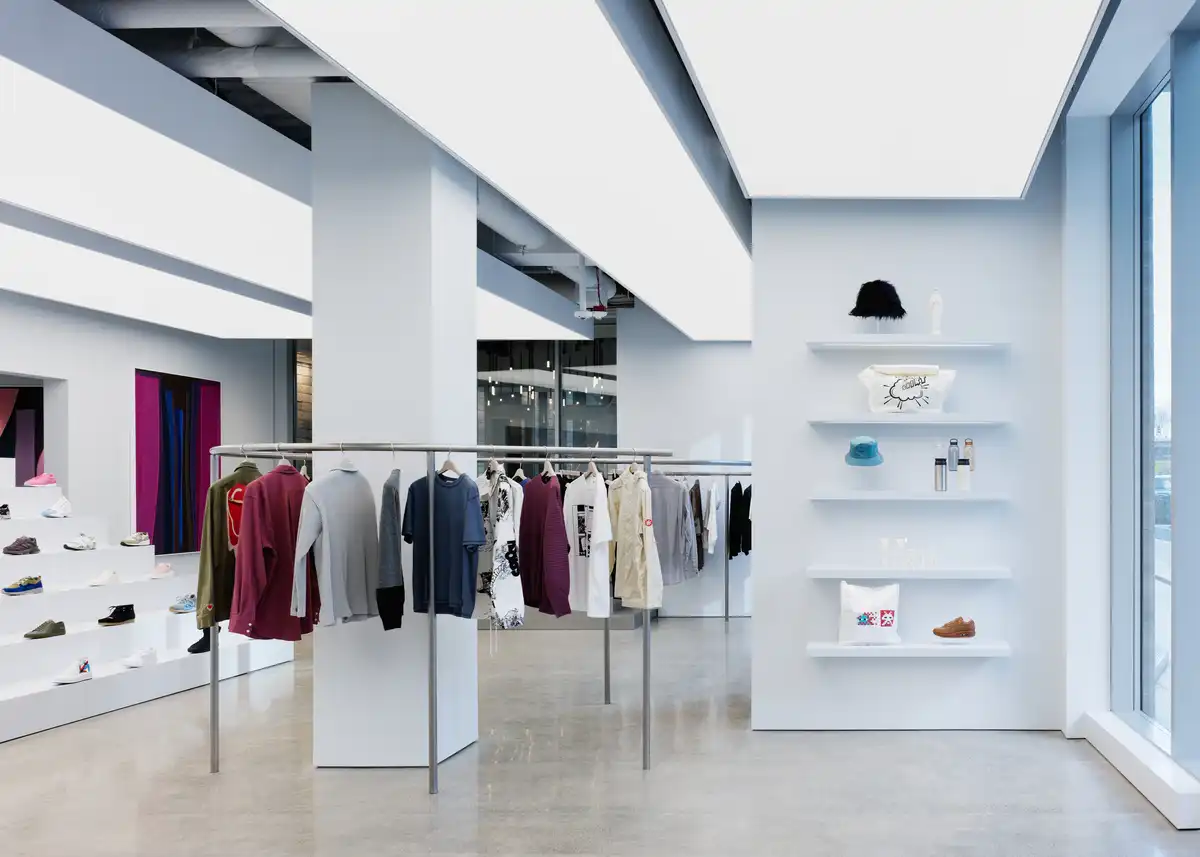 This new and enlarged 3,000 sf retail space spotlights the creativity and ingenuity of featured brands and offers a gathering space for the LIKELIHOOD community. The store design is inspired by an art gallery, with bright white walls and displays, mirrored dressing rooms, and a ceiling of “cloud lights”. The minimal palette and abstracted materials provide a stage for the colorful brands.