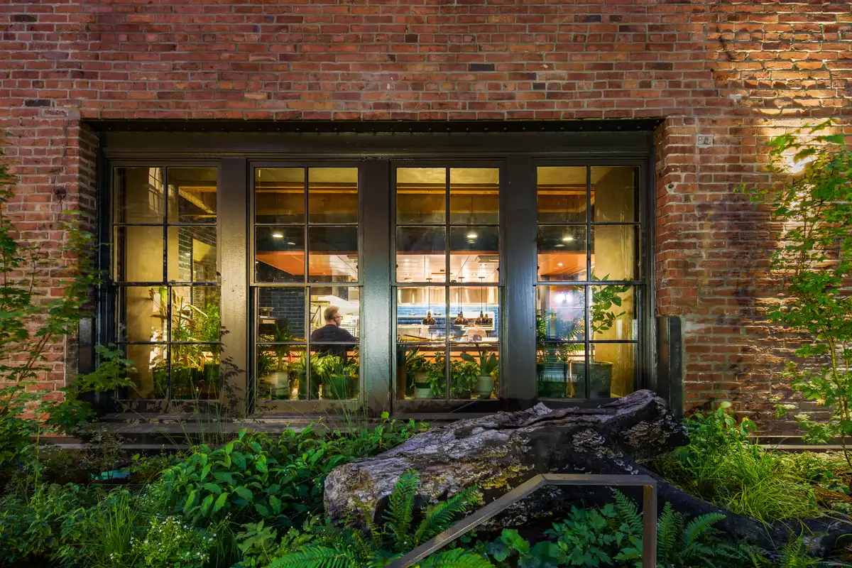 From there, a striking staircase leads to the second-floor restaurant and glass-wrapped solarium, where greenery creates a seamless flow between indoor and outdoor spaces. Above, the rooftop bar—with its sweeping views and verdant landscape by Site Workshop—anchors the hotel in the surrounding city and natural world. Pacific Northwest-rooted details and preserved architectural elements, including exposed historic car decking and brick, strike a deliberate balance between natural beauty and urban edge.