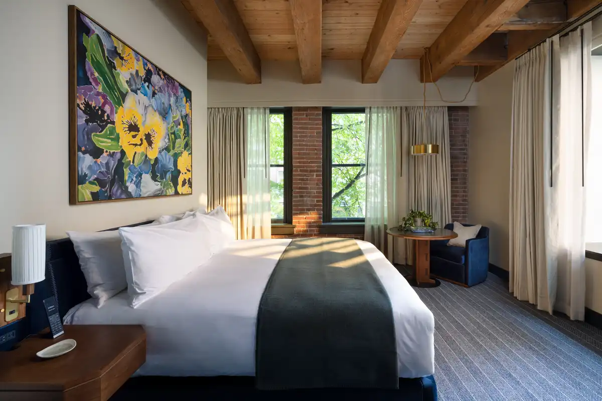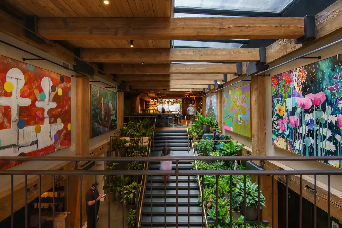 A cultural hub where art, music, history, culinary, and community converge, the hotel offers guests a deeply immersive experience. Guests enter through a lush, biophilic entry into a grand lobby where plants, nature-inspired artworks curated by ARTXIV, and preserved Douglas Fir beams speak to the building’s layered design story.