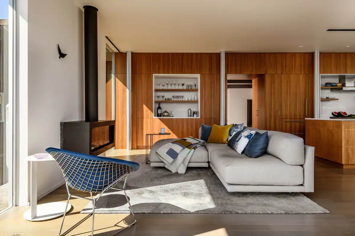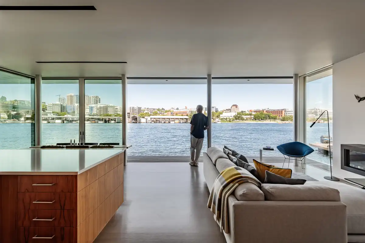 Expanses of glass open the downstairs living areas to the water, offering uninterrupted views of passing boats and seasonal wildlife. These glass walls are layered with operable elements—blinds, shutters, and screens—that allow for shifts between transparency and enclosure, providing both engagement with the surroundings and moments of retreat.