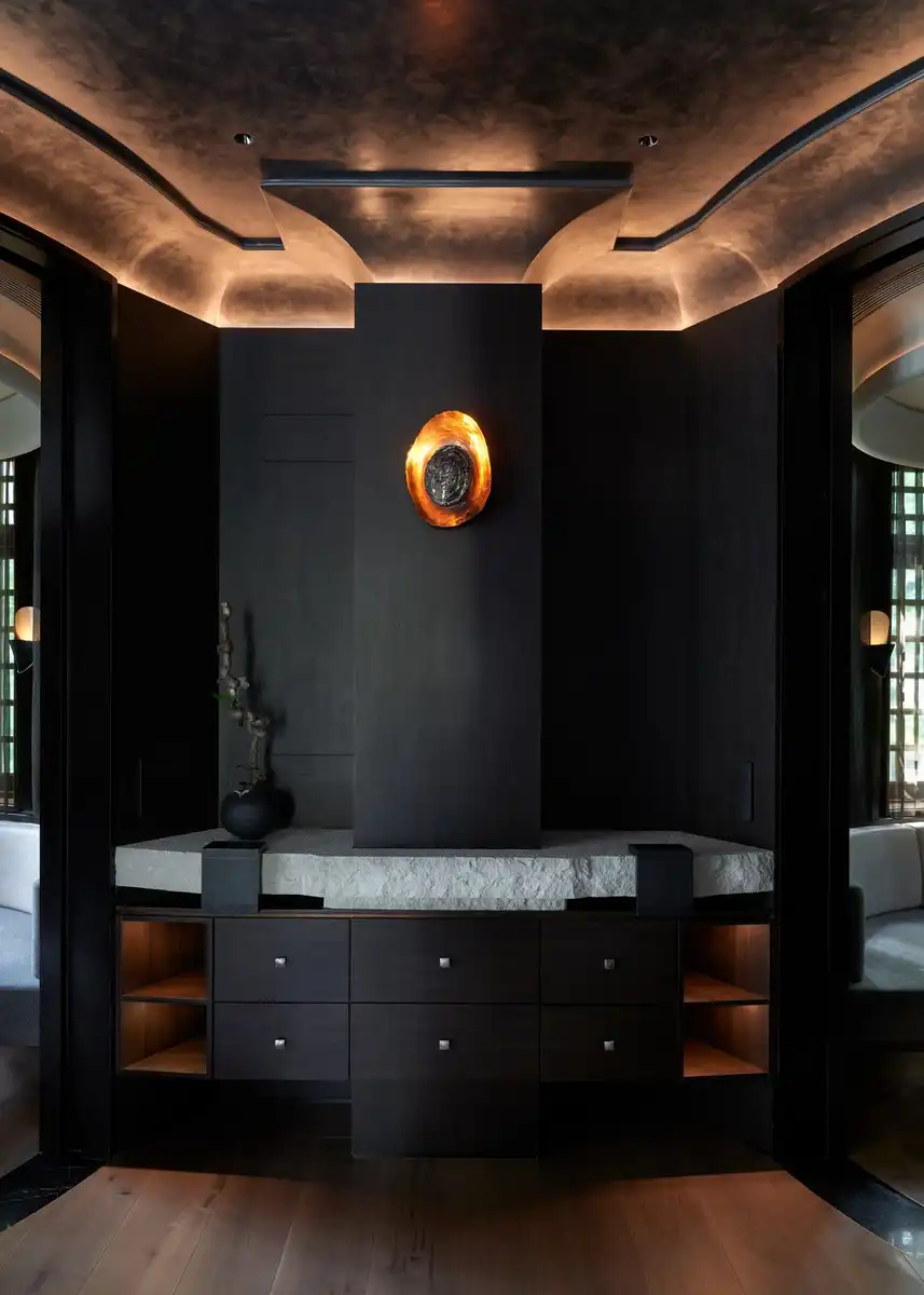 Guests are invited to experience luxury redefined, one where simplicity and natural elements are emphasized. An opulent experience in harmony with refined details — sleek wood, natural stones, raw-effect metals and venetian plaster finishes come together to create an effortless naturalistic environment. This conversation between the organic, the subtle refinement of Norway and China’s historical blending of science and nature goes on throughout the space.
