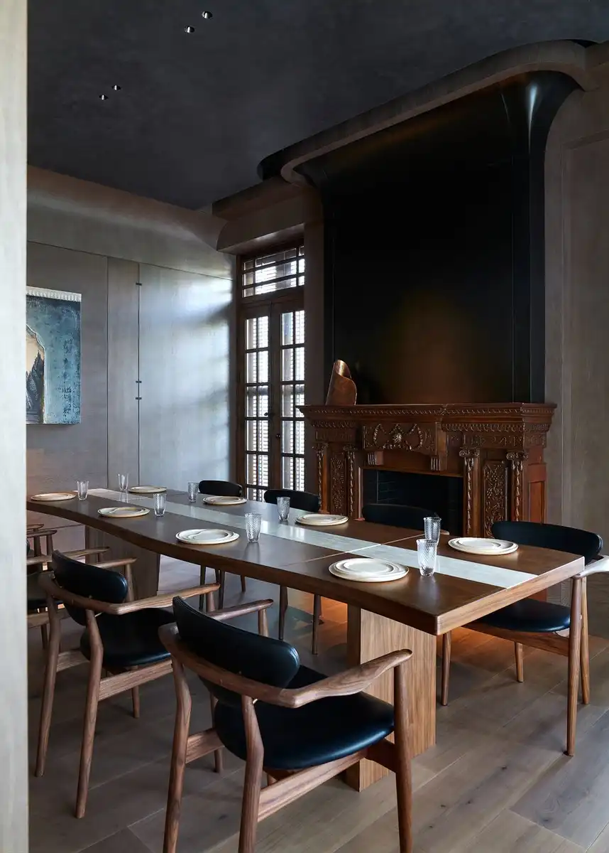 Whilst maintaining the integrity of the architecture of the original villa, a more minimal and modern approach has been taken towards the design of the second-floor dining room. Dark, rich materials are applied to the interior architecture and furnishings, opting for a heavier atmosphere, where frivolous details could lack. This contrast to the ground floor is emphasized by the beauty of woods and metals, highlighted for an intended contrast.