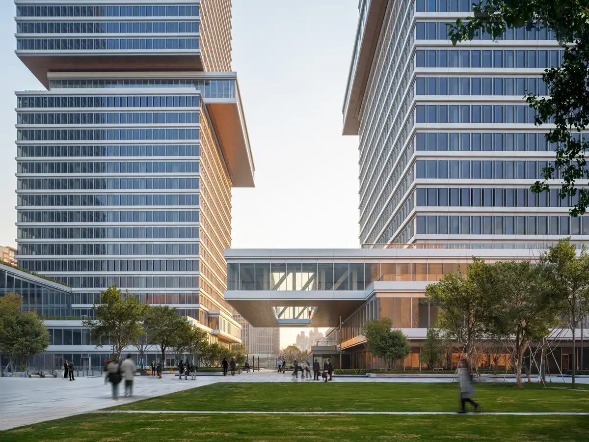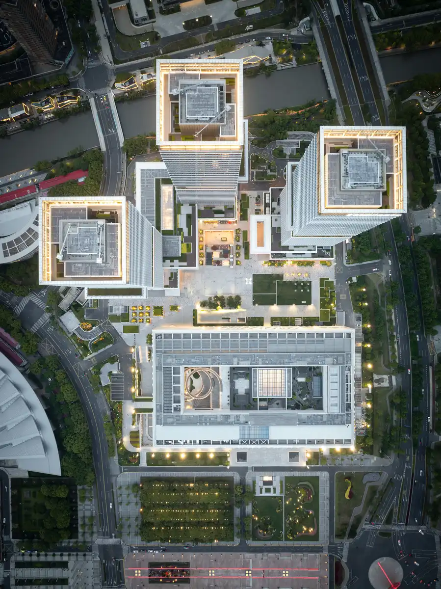 Conceived as a synthesis of culture and commerce, Huamu Lot 10 – The Summit reimagines participatory urbanism by transforming a neglected riverfront into a civic destination. Adjacent to Century Park and the Huangpu River, the development unites three office towers with an adjacent museum through a series of projecting Sky Galleries.