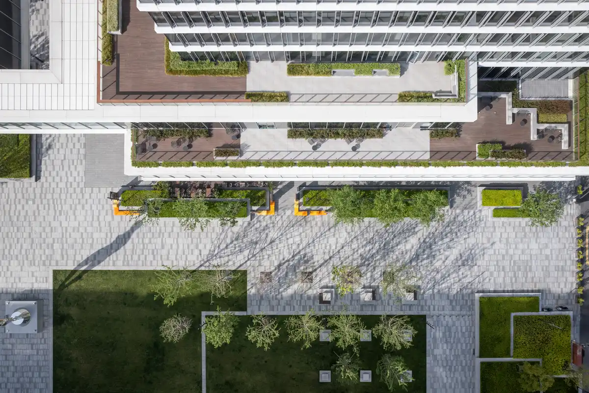 Sustainability and technical innovation underpin the project. Rainwater harvesting, vegetative roofs, and resilient waterfront landscapes mitigate flooding, reduce heat gain, and restore ecological function. Structurally, the development employs steel trusses and a double-slab system to achieve the ambitious cantilevers.