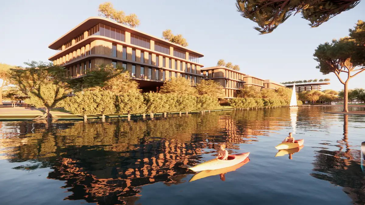 The terraced building forms of the hotel cluster maximize lake views, daylight, and natural ventilation. Sustainability is embedded at every scale, with a zero-carbon vision achieved through high-performance building envelopes, passive design strategies, renewable energy systems, and water-sensitive landscapes that enhance lake ecology and manage stormwater.