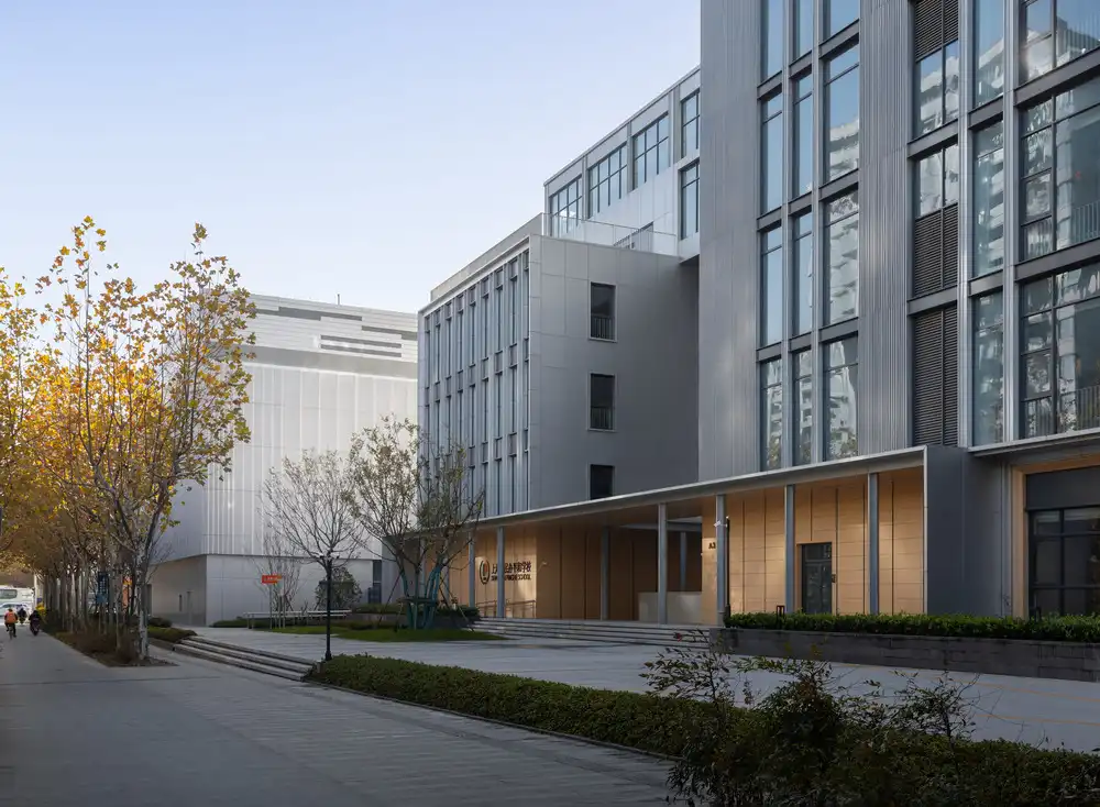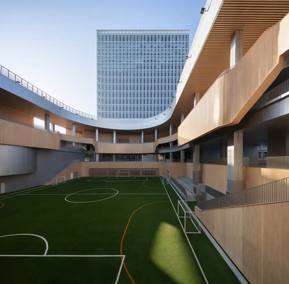 Located in the new CBD of the city, Shanghai Pinghe School Jinding Campus is bound to be a unique existence due to its high floor area ratio requirement of up to 3.0, international teaching mode, and high-density surrounding urban environment. As part of the nine-square grid neighborhood, this plot has clearly defined requirements for building density, floor area ratio, setback regulations, urban public spaces, and underground spaces, as well as architectural style and image, to form a cohesive entity with the surrounding eight plots.