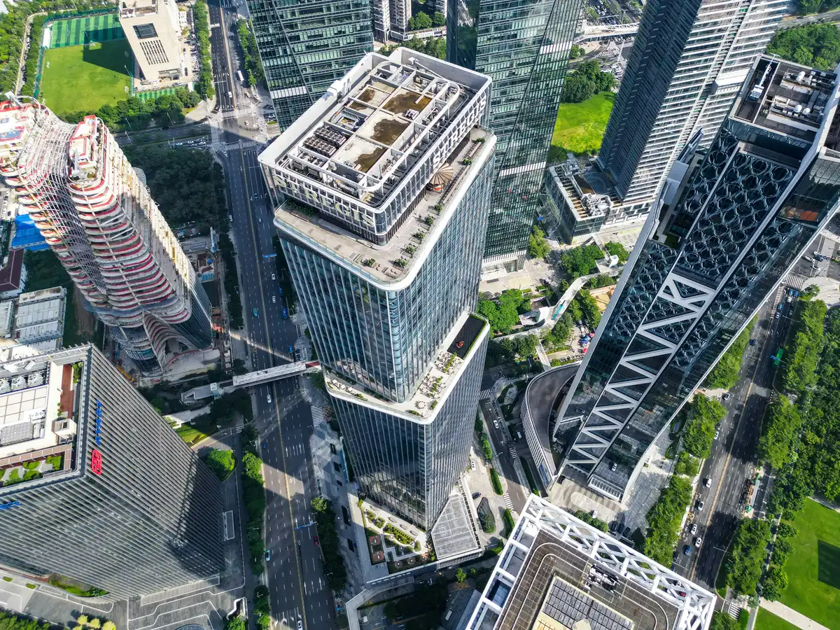 The tower’s façade features silver aluminium plates and glazed curtain walls, exuding elegance and simplicity. Its intricate vertical ribbing and finely detailed corners further enhance its architectural appeal, making the tower a striking addition to Shenzhen’s skyline.