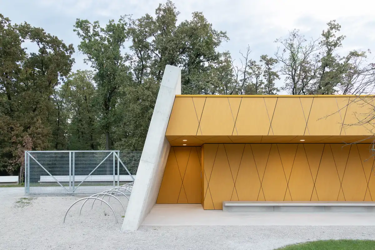 The interiors are equally considered. Wooden finishes bring warmth and tactility, while roof windows punctuate the ceiling to admit daylight and enable natural ventilation. These passive strategies reduce the need for artificial lighting and mechanical cooling, contributing to the building’s energy efficiency. Although built from robust materials such as concrete and laminated panels, the pavilion demonstrates sustainable principles through its compact footprint, long-lasting construction, and reliance on natural light and air.