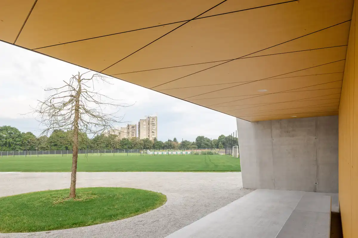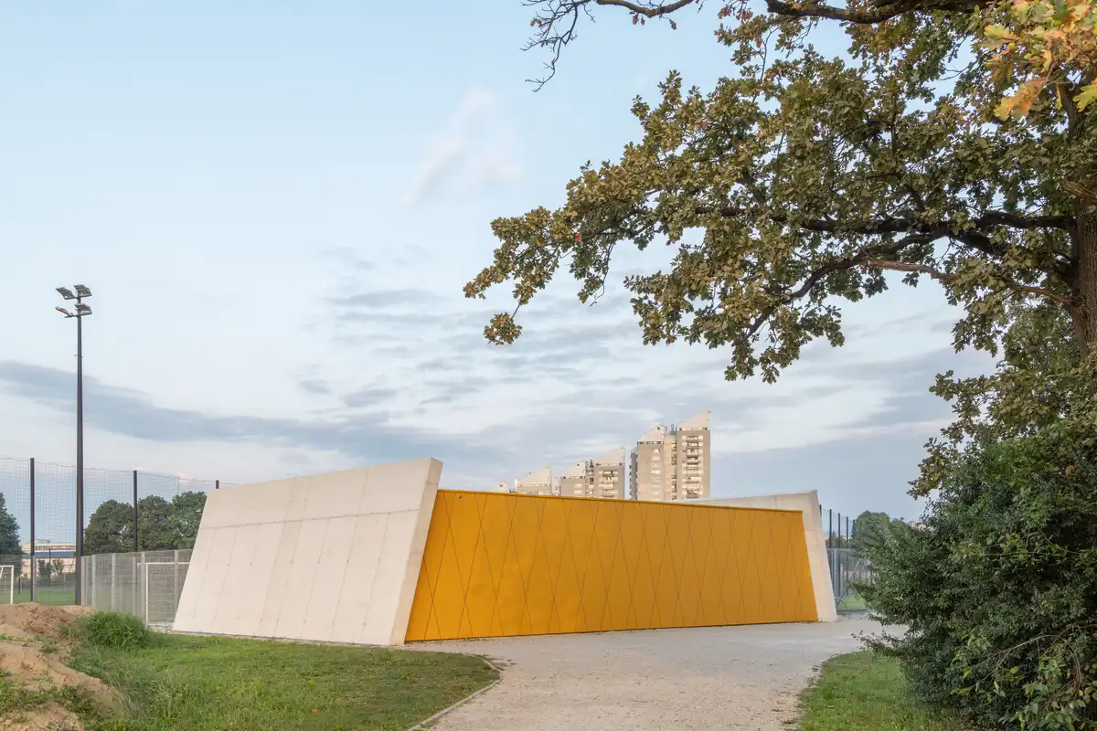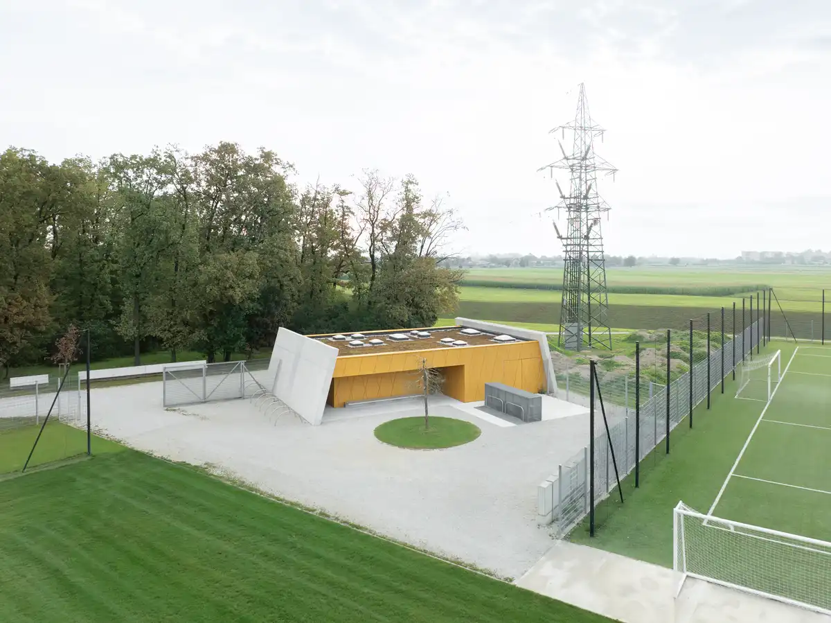 The pavilion by the auxiliary football fields in the Stožice Sports Park is the first completed structure of the long-planned public park within the wider Stožice Sports Complex. Commissioned by the City of Ljubljana, it inaugurates a family of future pavilions, each foreseen to host a different program and to gradually populate the park with facilities that address sports, recreation, and everyday public life.