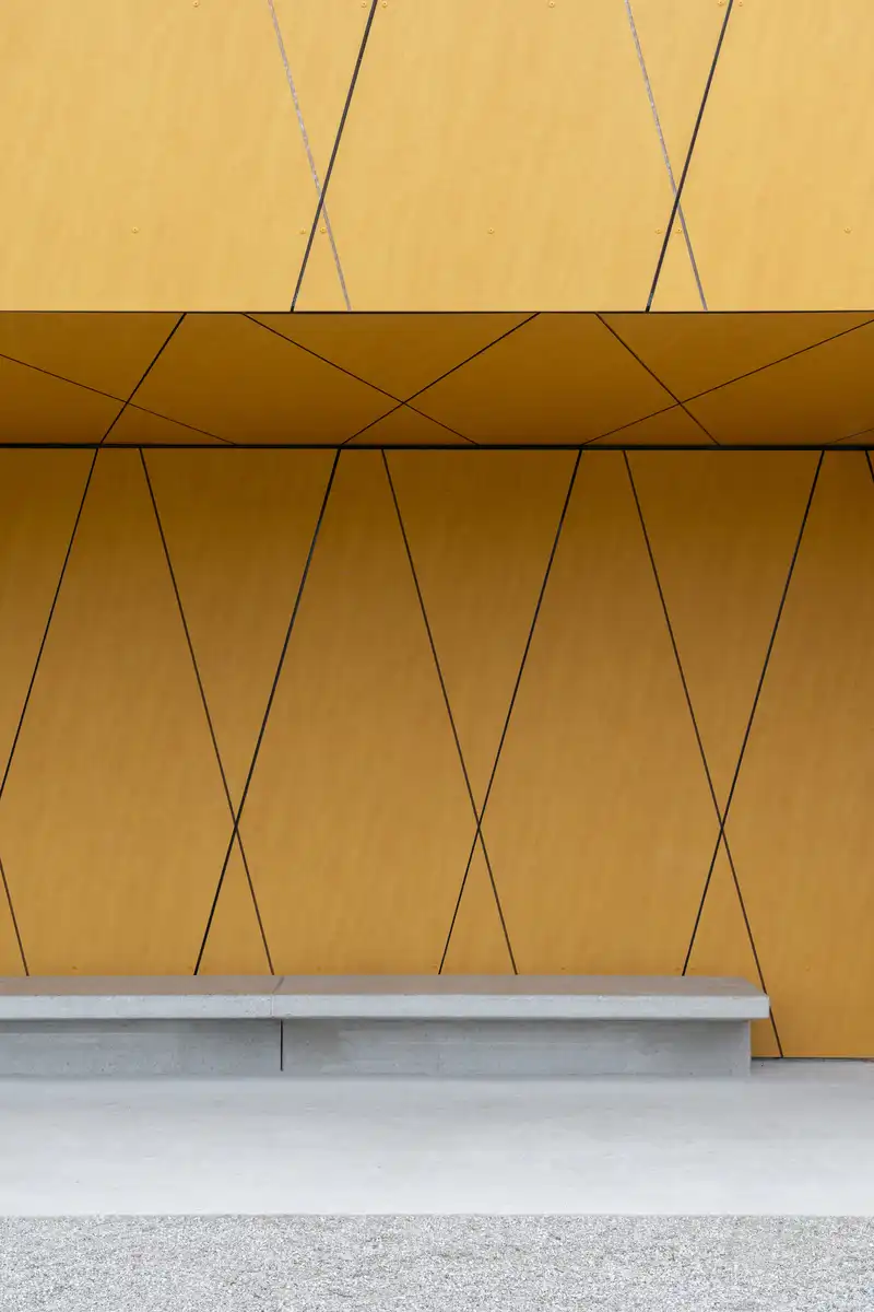 Externally, the building is wrapped in a ventilated façade of laminated panels. Arranged in a rhythmic grid, the panels create a dynamic optical effect: as the viewer moves, the lines alternately break, align, or overlap, producing subtle shifts in appearance. This interplay of order and disruption lends the pavilion a sense of stability that is never static, echoing the movement and energy of the sports taking place around it.