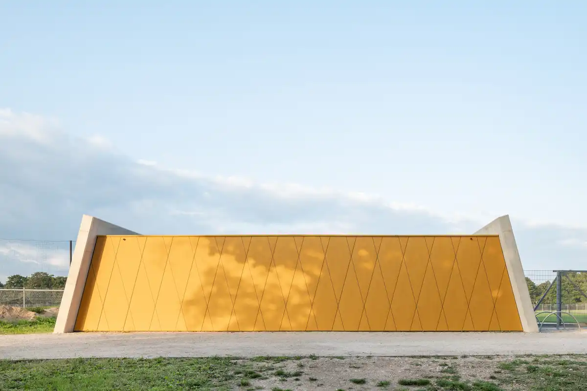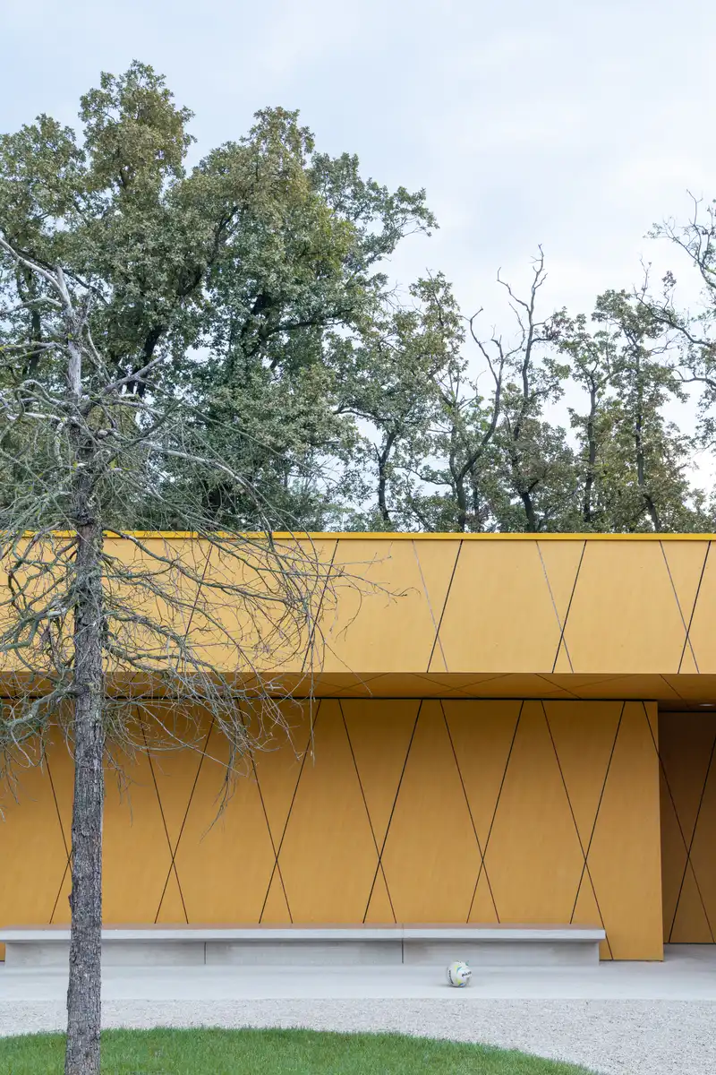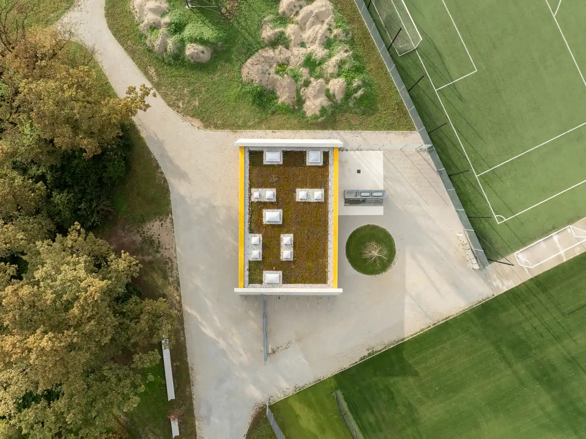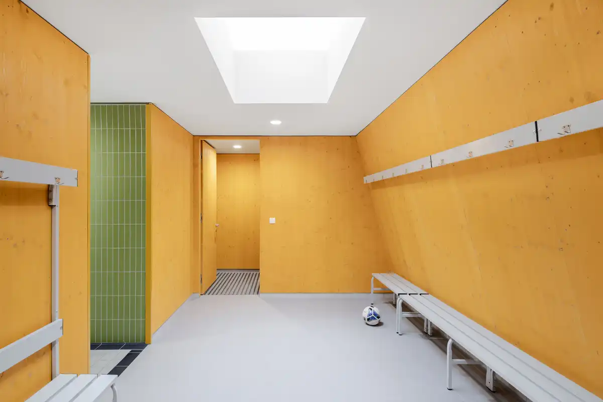 This first pavilion was built to accompany the auxiliary football fields, providing players with the essential facilities they lacked until now: changing rooms, showers, and a dedicated support and recovery space. Separate areas are reserved for referees and coaches, ensuring the building responds to the full ecosystem of the sport. Compact in size yet precise in function, it allows smaller football teams to fully prepare for training and games on site.
