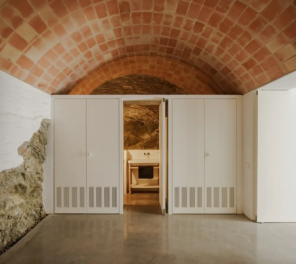 The house is organized over four levels. The ground floor, with its distinctive vaulted ceiling, is conceived as a flexible space: it can serve as a play area for children or as storage for nautical equipment. A small patio — added during the renovation — allows natural light and ventilation into a room carved into the original rock, adding spatial and material value.