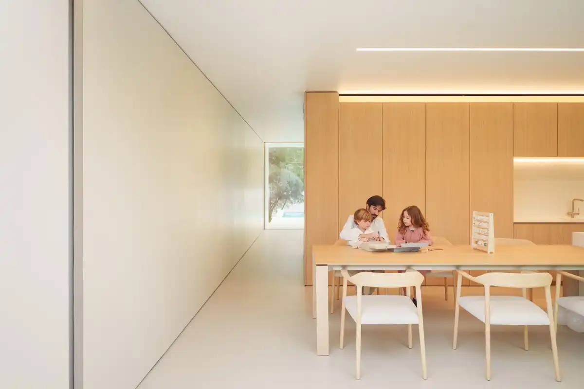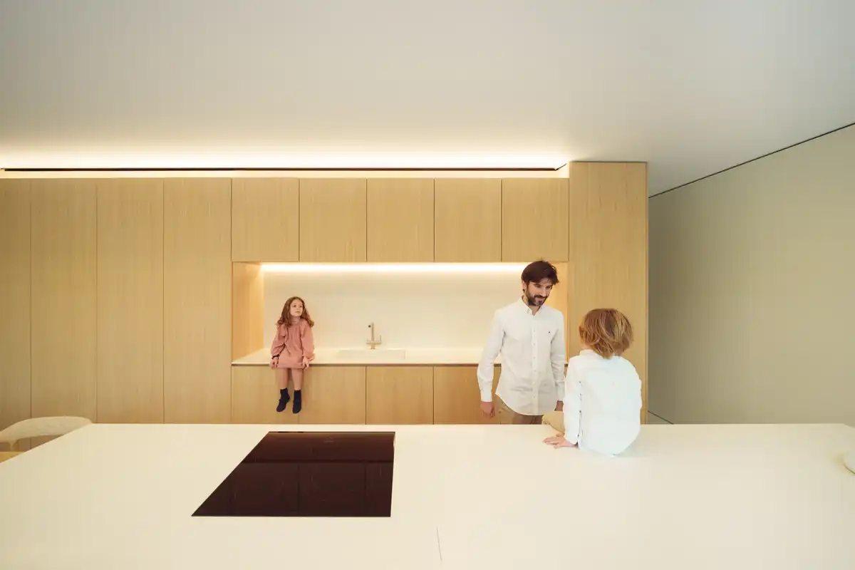 The house is conceived using a palette of warm tones, with a predominance of RAL 9016 white, while the central elements and furniture pieces are resolved through light oak paneling, providing balance and warmth.