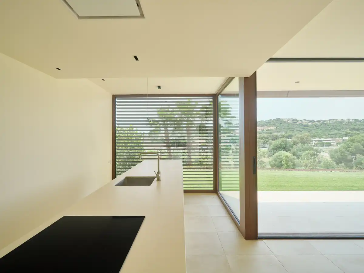 Las partes opacas del edificio están revestidas con cerámica esmaltada de color arena, mientras que el resto es de vidrio. El jardín conserva el terreno natural y la vegetación silvestre, complementado por una piscina infinita en el borde de la parcela que completa los espacios de ocio.