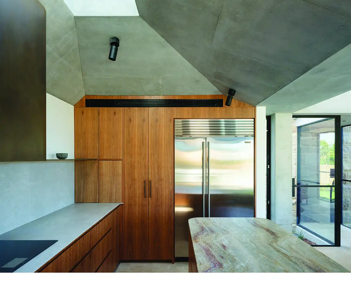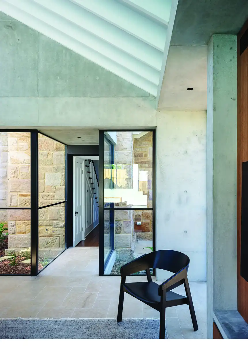 Cairngorm House is an elegant, heritage listed, double-storey sandstone dwelling separated by a glass walkway and courtyard with a heavy, concrete form extension punctuated by expansive apertures allowing the sun to trace its way throughout the day.