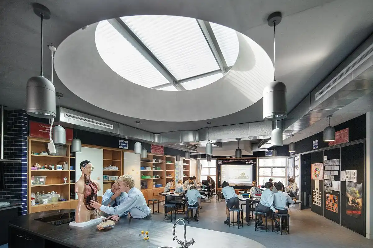 The architecture responds to the significant changes experienced by the students as they grow throughout their school years. Lower-scale buildings for the kindergarten to second year schoolchildren are located adjacent to the surrounding residential neighbourhood.