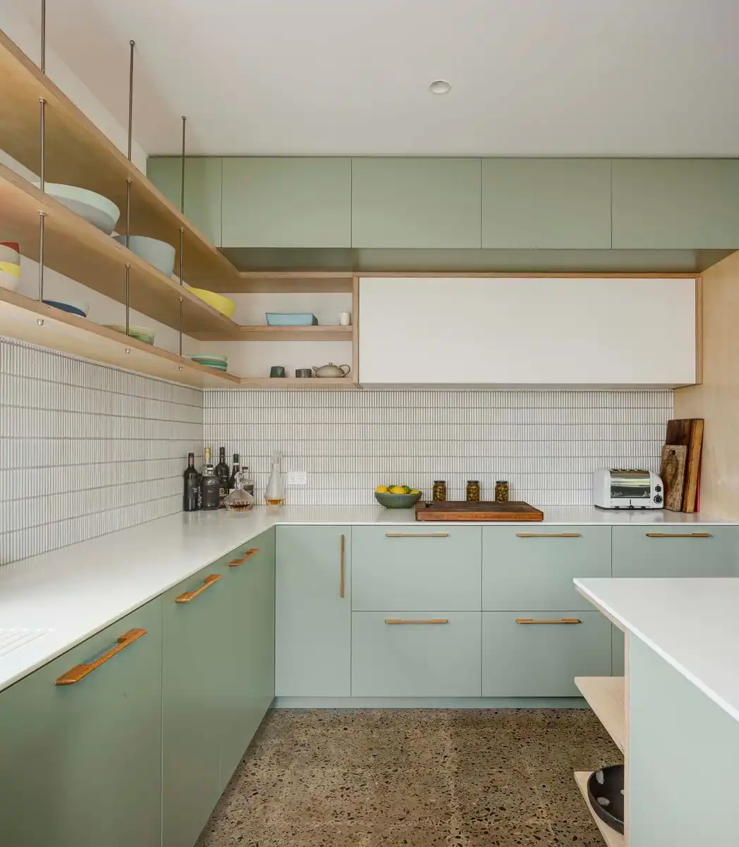 Carefully chosen finishes and fittings, such as tiles and light fittings, were selected with costs and quality firmly in mind. The affordable detailing and materiality of the built-in joinery, in blue, green and neutral colours, allowed generous fit outs throughout the home.