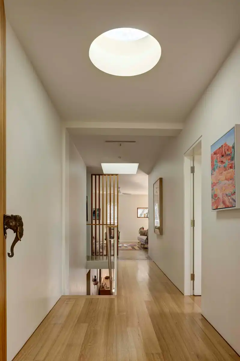 Internally the entry level was re-configured to house a foyer/mud room, generous open kitchen, living, dining and a parent’s bedroom/bathroom. Existing structural slabs were exposed, cut and polished for a terrazzo-like floor finish. Two skylights, a timber screen and a fine timber and steel balustrade add light and detail to the updated entry sequence.