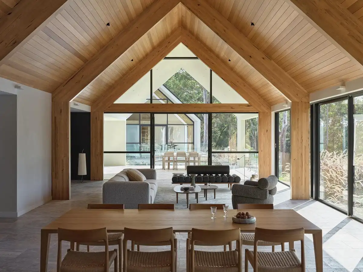 Prefabricated Victorian Ash CLT minimises pollution and extends material life, while double-glazed bushfire-compliant panels enhance energy efficiency.