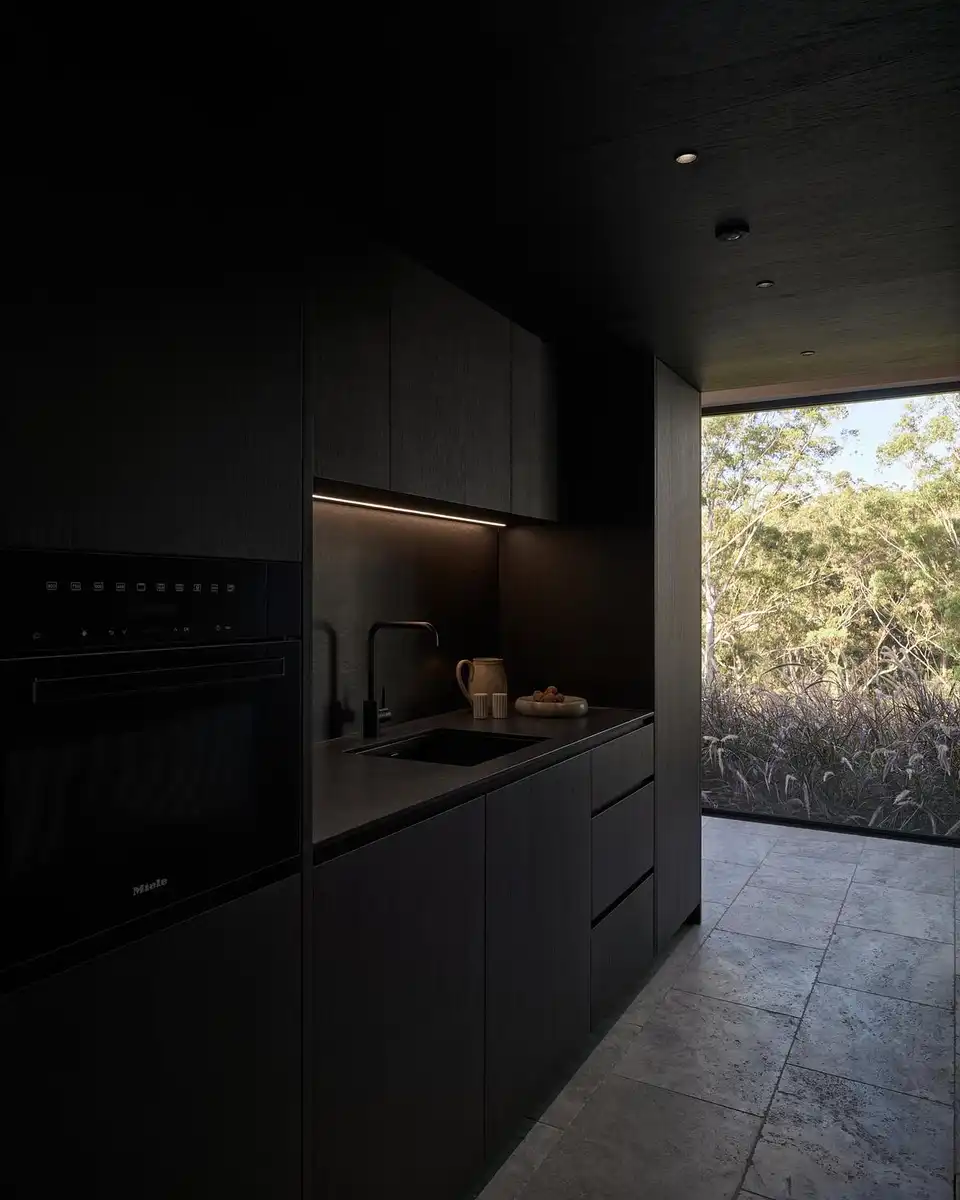 Materially, the house favours a palette of durability and tactility: shou sugi ban charred ironbark and black steel form a robust exterior, while inside, Victorian Ash CLT portals, Tasmanian Oak ceilings, and bespoke timber joinery bring warmth and craft. Travertine floors and hydronically heated concrete slabs enrich the interior experience, complemented by high-performance glazing. Off-grid systems — solar generation, rainwater harvesting, and on-site treatment — ensure sustainable autonomy.