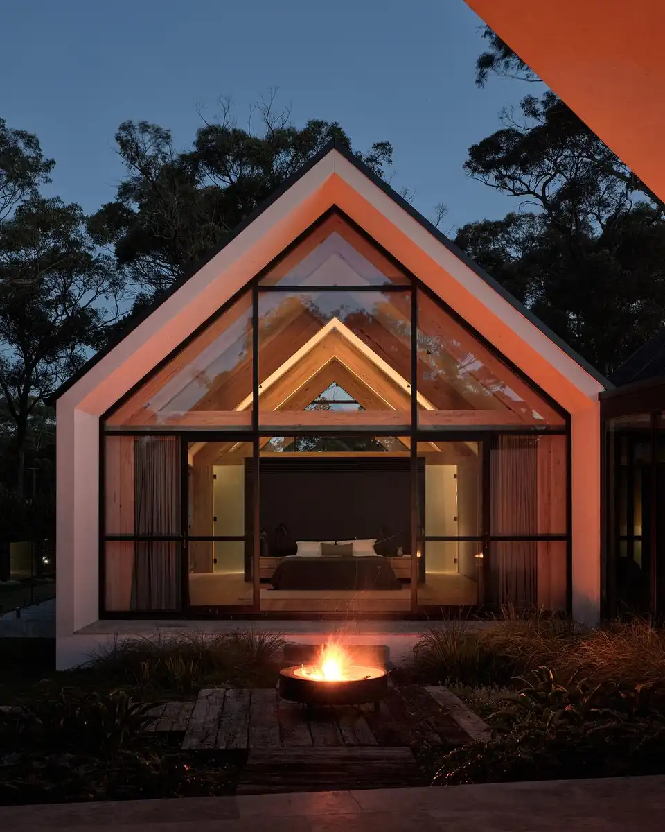 The design follows natural contours, inscribing glass-lined walkways that connect wings like a necklace across the escarpment. Courtyards, a billabong-like pool, and firepit gatherings extend the architecture outward, framing dramatic views while nurturing intimate family life. Crafted for a master builder and his son, the house is both deeply personal and environmentally experimental, with staged CLT construction refining each pavilion over time.
