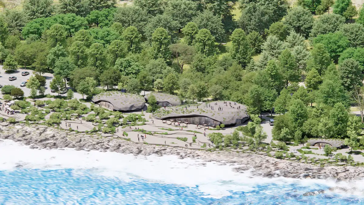 MVRDV’s masterplan replaces and improves the old infrastructure while enhancing the park’s natural identity. All new construction will be confined to areas that are already developed to avoid disrupting the original natural landscape. Inspired by the layered forms of the coastline, the design breaks up the existing straight road and reimagines recreational pathways as a cracked, rocky, naturalistic landscape that stitches the forest and the coastline back together. The rock-like fragments define various zones for circulation and public activities while some are extruded into buildings that echo the natural features of the local rock formations, blending into the surrounding environment.